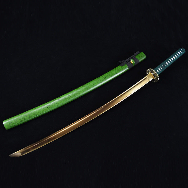 Carbon Steel Green Samurai Sword with Gold Blade Description