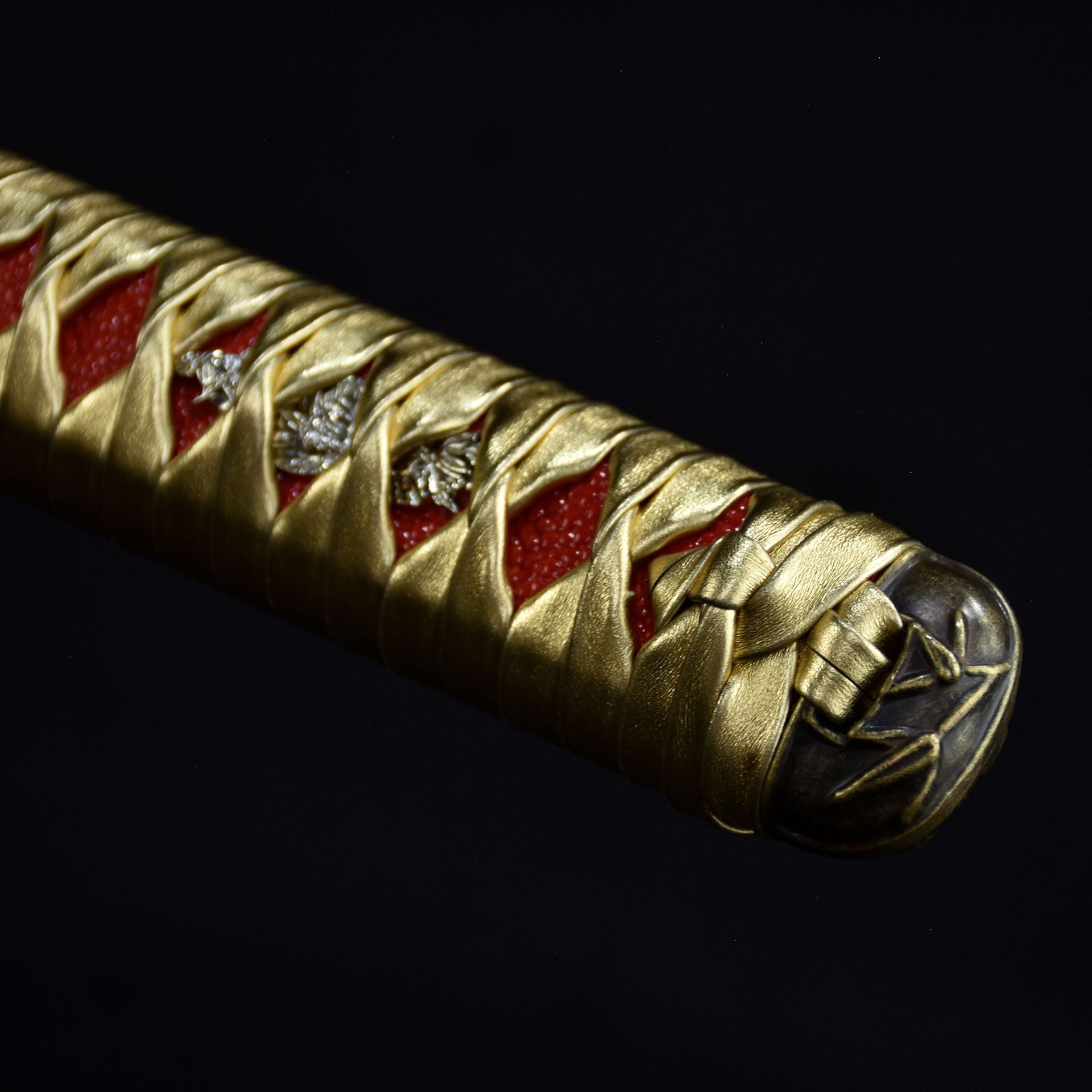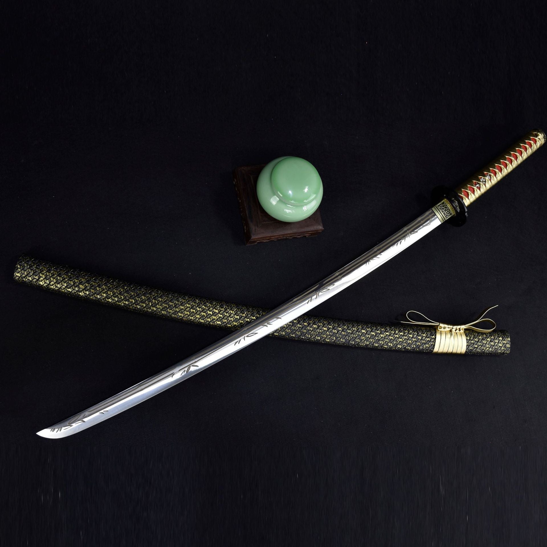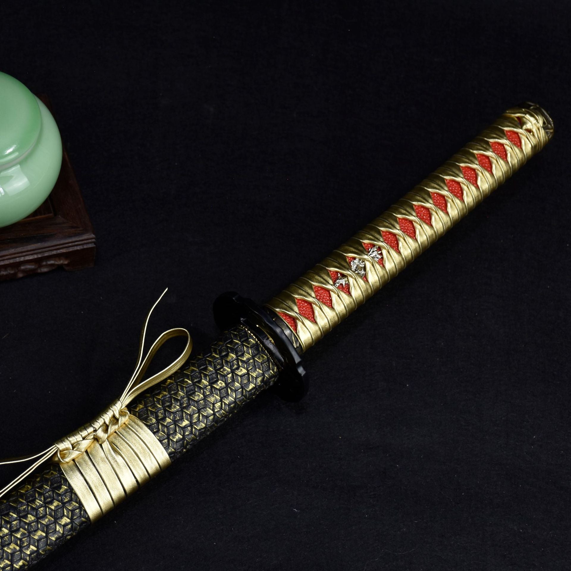 The Black and Gold Katana Japanese Sword is a full tang sword, constructed from a single piece of stainless steel. The handle is wrapped in black and gold synthetic silk for a comfortable grip. The blade is engraved with a traditional Japanese pattern and is curved for maximum cutting power.Stainless Steel Katana Black and Gold Katana Japanese Sword: Quality and Durability