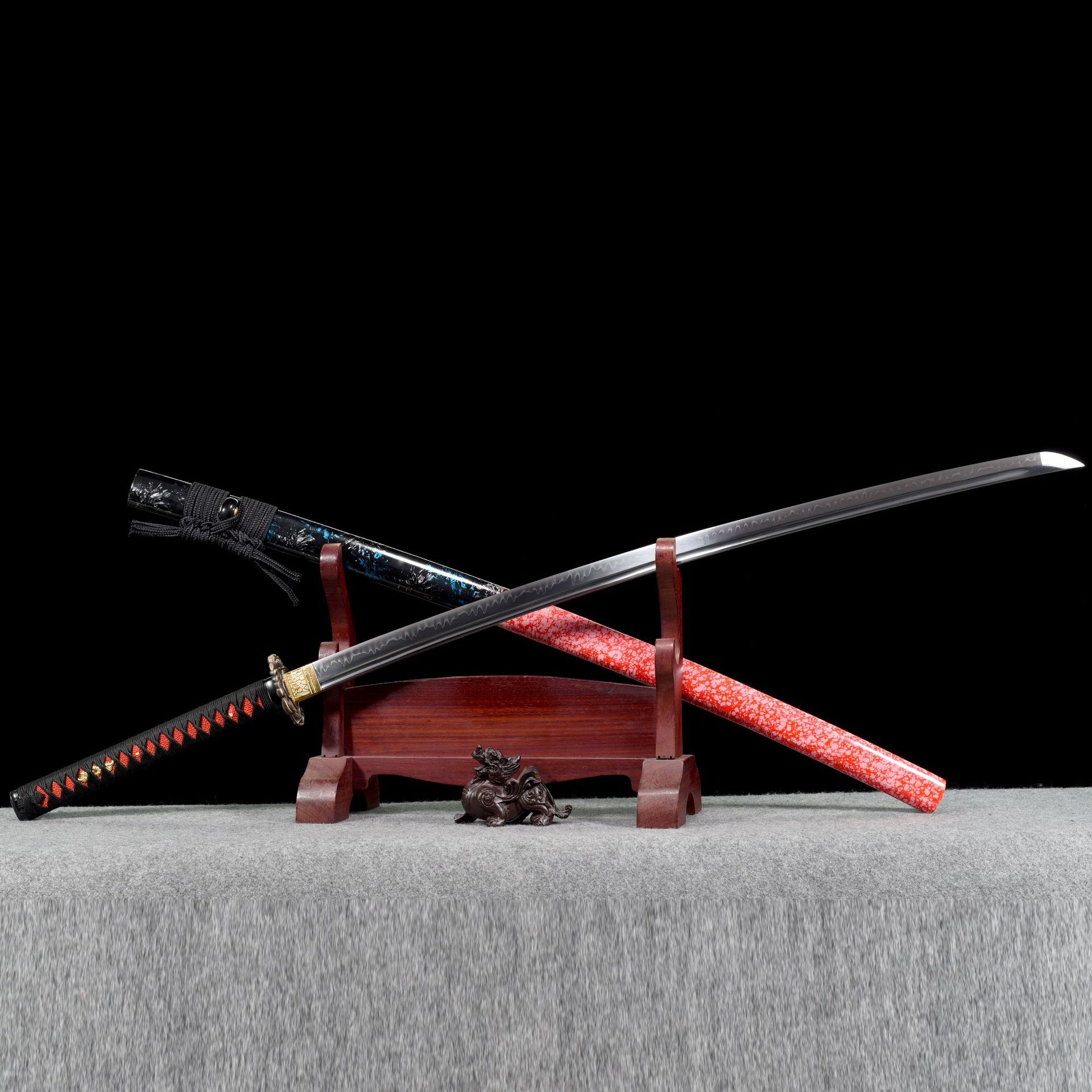 The T10 Carbon Steel Blue and Red Samurai Sword is crafted from high-quality T10 carbon steel, which makes it incredibly durable and resistant to wear and tear. The blade has also been hand-forged for maximum strength and is razor-sharp for cutting through even the toughest material.The sword also features a traditional red and blue color scheme, which gives it a classic look. It also includes a full-tang design for enhanced balance and stability. The red samurai sword also comes with a durable black lacquered wooden scabbard, which makes it easy to carry and store.